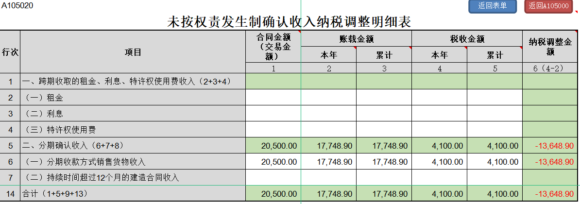 第一步:填写《A105020未按权责发生制确认收入纳税调整明细表》(单位:万元)